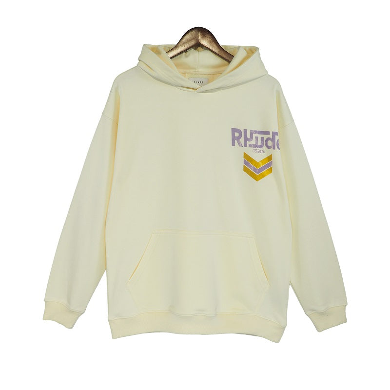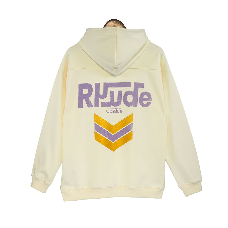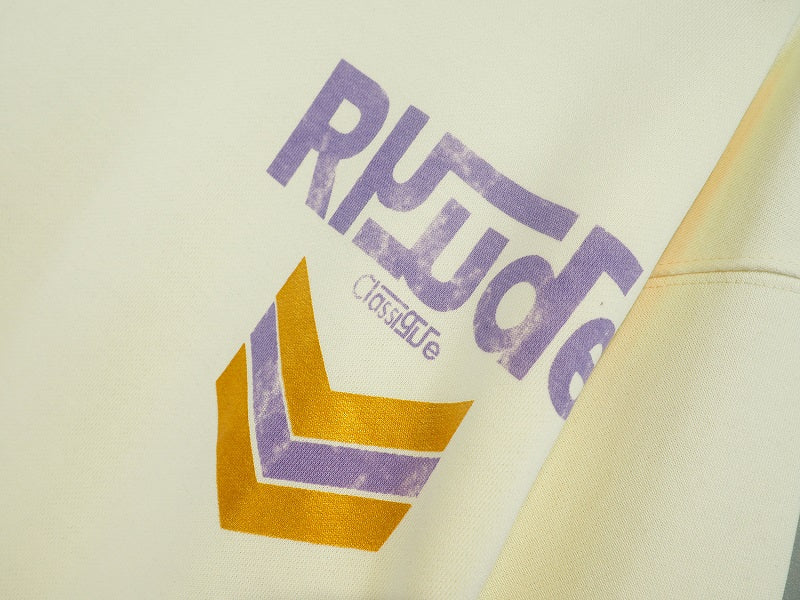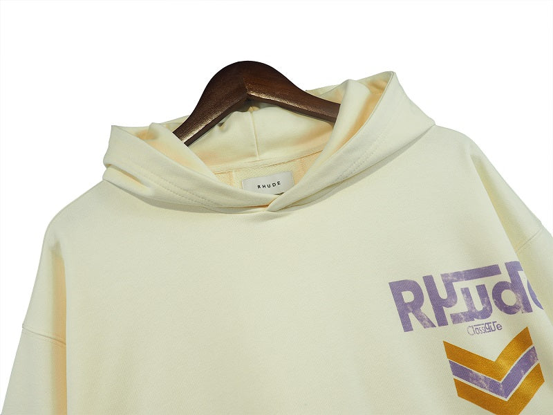 LONG SLEEVE FRENCH TERRY HOODIE WITH "RHUDE CLASSIQUE" GRAPHICS PRINTED THE FRONT AND BACK. FEATURING A KANGAROO FRONT POCKET AND DROPPED SHOULDERS. EACH PIECE IS UNIQUE AND INTENTIONAL PRINT DISTRESSING MY VARY PER STYLE.